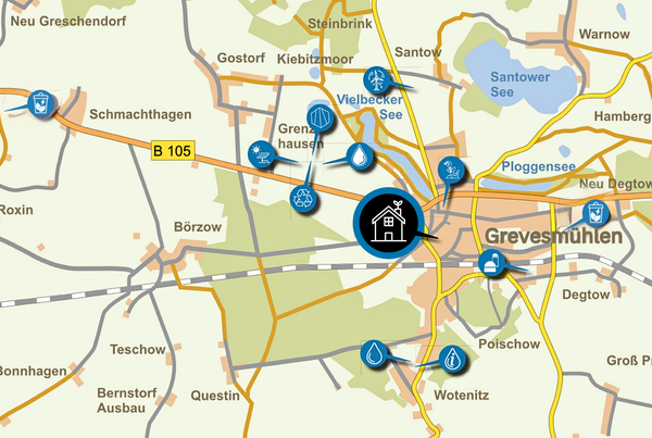 Die Lernortafel befindet sich im Park der Bürgerwiese, hinter den Häusern der August-Bebel-Straße 44/46 in 23936 Grevesmühlen.